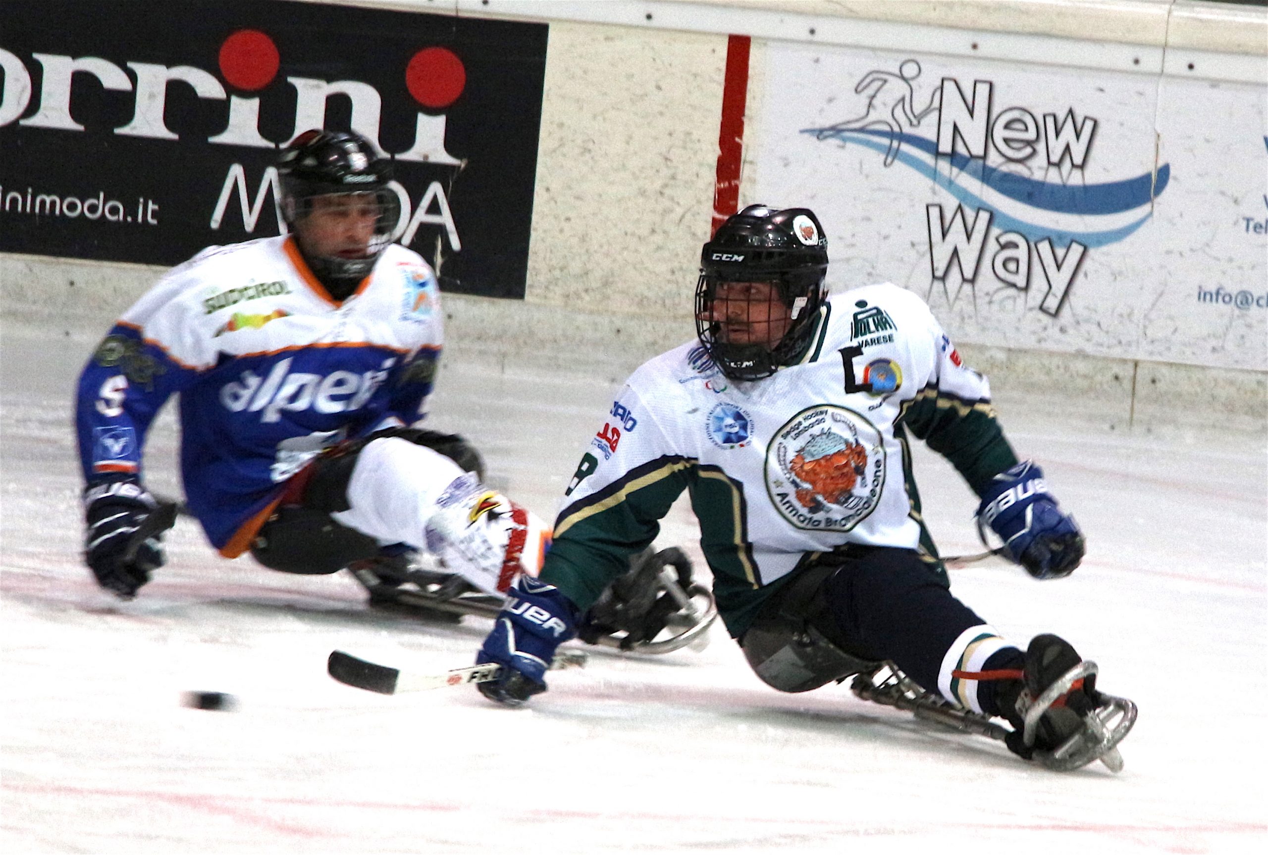 E’ stato un festival di reti quello che ha caratterizzato il fine settimana al Palaghiaccio di Varese sede della doppia sfida valida per il campionato nazionale di sledge hockey tra l’Armata Brancaleone Lombardia e le Aquile Alto Adige. Troppo forti gli alto atesini guidati dal bomber di razza Florian Planker, campioni d’Italia in carica e spina dorsale della nazionale azzurra. La partita di sabato sera è terminata con un 7 a 0 che la dice lunga sulla superiorità degli ospiti che hanno firmatario la vittoria con tre doppiette di Planker, Larch e Depaoli e la rete di Rosa. Festeggiato insieme il quarto tempo nella cena servita nella sede della Polha Varese, le due squadre di sono ritrovate nella tarda mattinata di domenica mattina con l’Armata decisa quanto meno a bucare la difesa avversaria. Seppur sconfitti anche nella seconda partita, 6 a 2, gli uomini di coach Malfatti hanno dato segni positivi con due reti messe a segno dai giovanissimi Emanuele Parolin e Lorenzo D’Andrea. Per D’Andrea si tratta della prima rete personale. Entrambi emergenti, frutto del lavoro infinito in tema di promozione dello sledge hockey che vede la Polha in prima linea fin dalla sua prima apparizione in Italia prima delle Paralimpiadi invernali di Torino 2006 alle quali la nazionale azzurra venne qualificata di diritto in quanto Paese organizzatore.