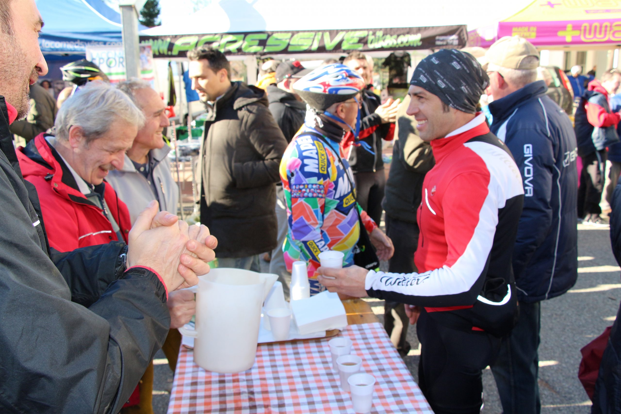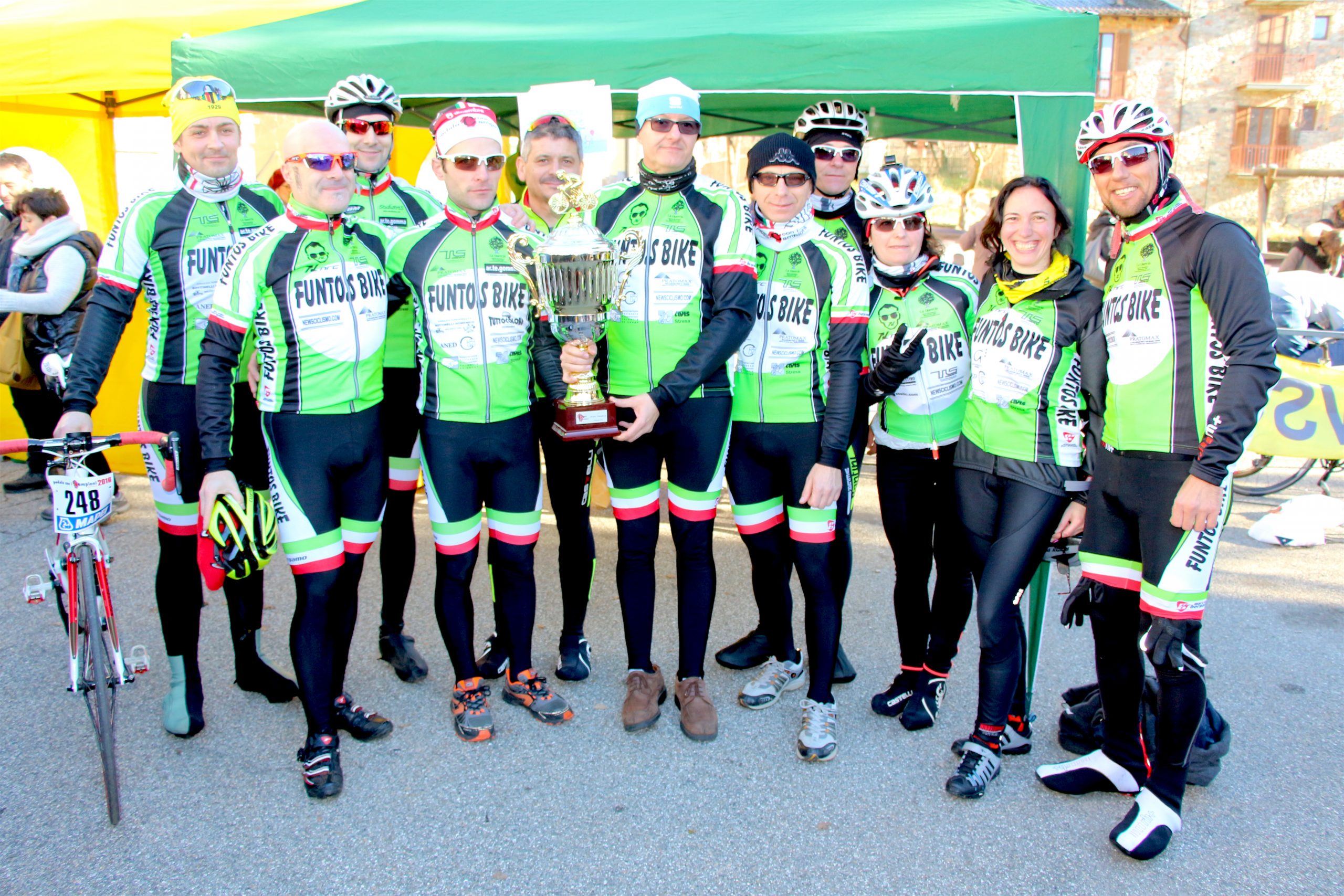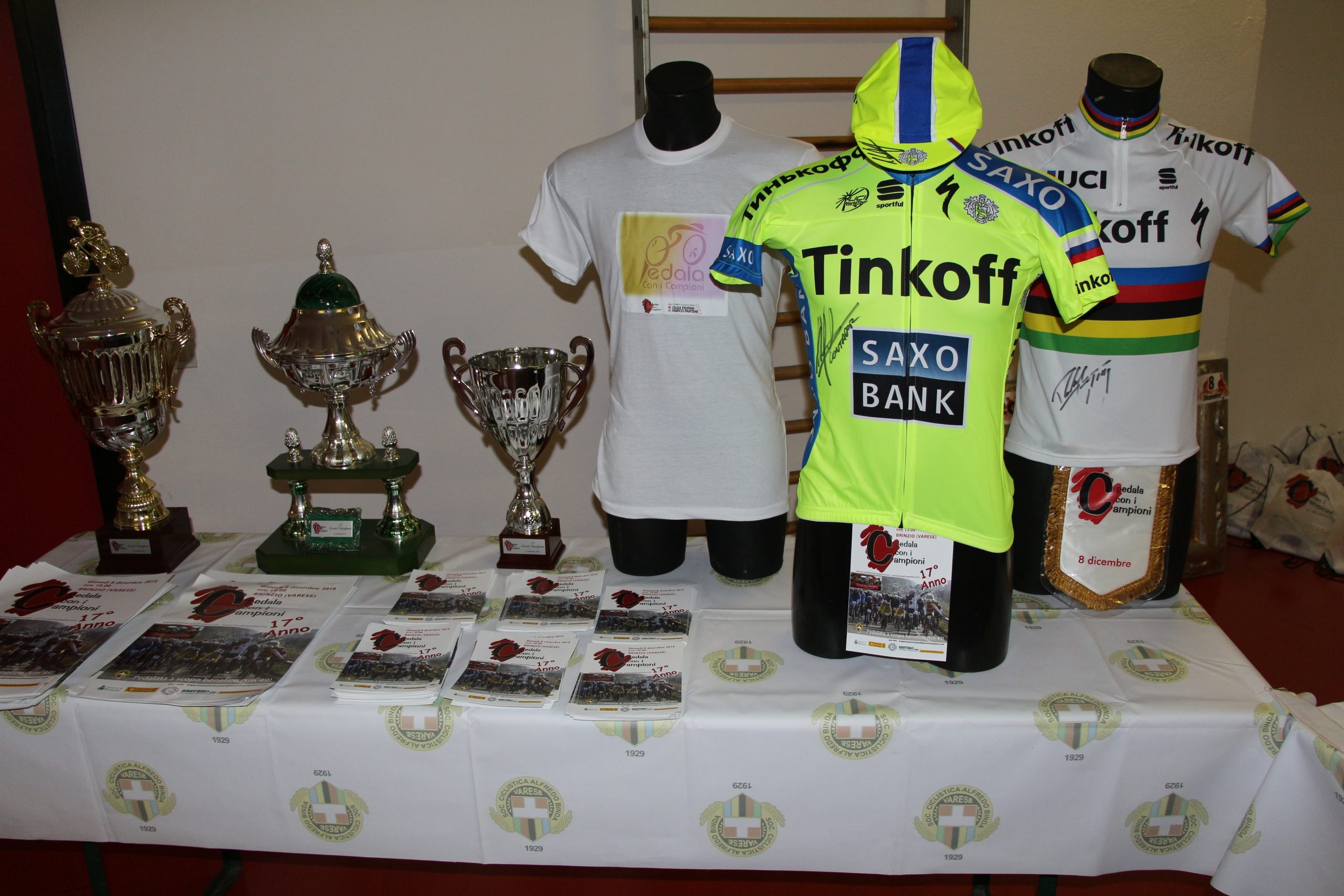 Sempre nello stesso punto si sono fermati anche alcuni componenti dell’Associazione “Sulla loro scia” di Cassano Magnago dedicata ai due corridori Alessandro Giani e Stefano Pietrobon scomparsi prematuramente. Nel villaggio di partenza l’Associazione Adiuvare ha offerto un servizio per l’esame della glicemia mentre in coda al gruppo il servizio scopa è stato garantito con i pulmini delle associazioni Freerider Sport Events, Spina Bifida Italia e Vharese. All’arrivo a Brinzio sono stati consegnati i riconoscimenti ai gruppi più numerosi. Sul gradino più alto del podio la Funtos Bike. Inoltre, come sempre, sono state estratte a sorte le maglie messe in palio dai campioni di ieri e di oggi. Tra le più ambite quelle inviate da Contador e dal campione del mondo Peter Sagan.