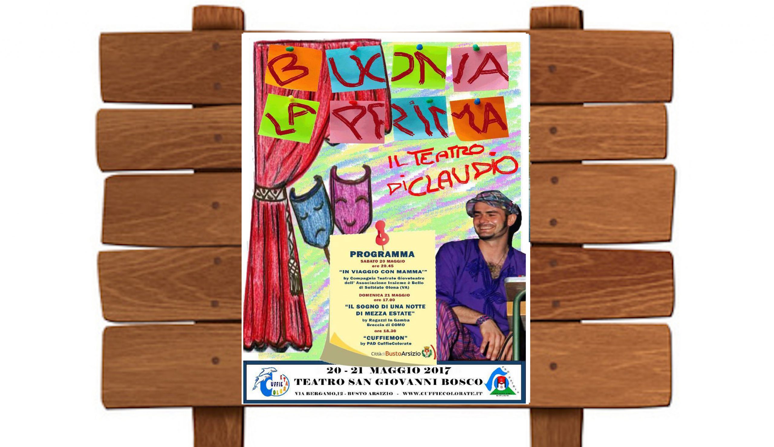 Sull’onda dell’entusiasmo dello scorso anno le CuffieColorate sono ad una settimana dalla seconda edizione della rassegna teatrale “Buona la Prima”, in programma nel prossimo fine settimana al Teatro Giovanni Bosco di Busto Arsizio, in Via Bergamo 12. “Cos’ è Buona la Prima? – attacca Barbara, una CuffiaColorata – E’ un progetto ispirato dal desiderio di condividere attraverso il teatro la voglia di divertirsi facendo divertire il pubblico, per tener vivo il ricordo di una persona speciale, il nostro Claudio De Bernardi, il Debe, che nella sua breve vita ha dedicato buona parte del suo tempo ad aiutare gli altri, diventandone Amico, ascoltandoli, incoraggiandoli, spronandoli a far emergere le loro potenzialità, facendo, lui per primo, un passo indietro per rendere i suoi protagonisti i suoi amici”