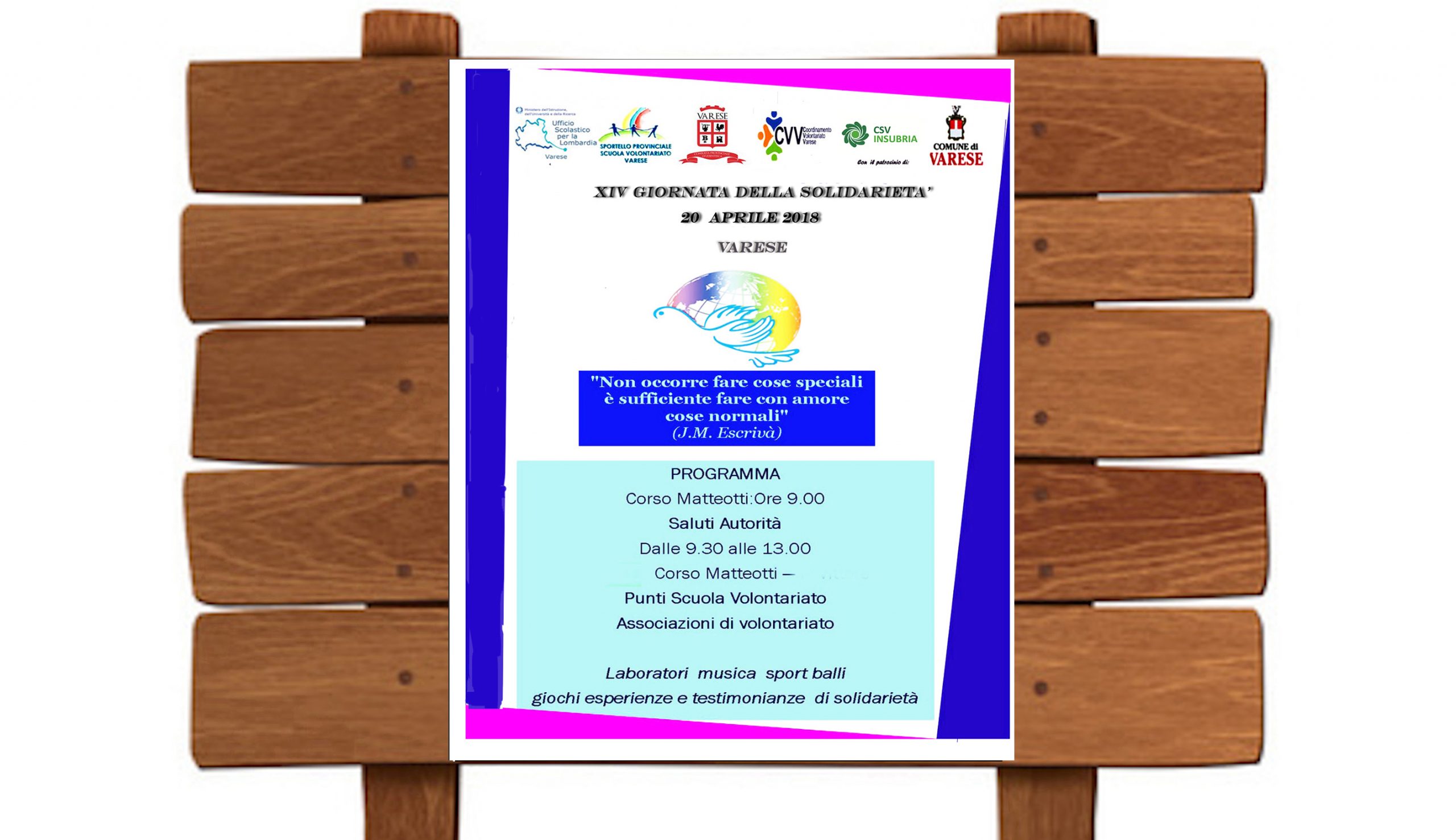 Domani mattina saranno più di 500 gli studenti delle scuole di ogni ordine e grado, accompagnati dai loro docenti, che animeranno a partire dalle ore 9.30 le vie del Centro Storico di Varese con laboratori, rappresentazioni, musica, balli, spettacoli con burattini, testimonianze, giochi ed esperienze di solidarietà. E’ tradizione dell’Ufficio Scolastico e dello Sportello Scuola Volontariato organizzare annualmente, in collaborazione con il Cvv e le Associazioni di Volontariato del territorio, una giornata dedicata al tema della solidarietà: molte infatti sono le iniziative realizzate dagli Istituti Scolastici che vedono il volontariato quale momento formativo per gli studenti. La mattinata sarà per i giovani un’occasione di informazione, di incontri, di riflessioni, di testimonianze su un tema di grande rilevanza e, per coloro che sono impegnati nel mondo del volontariato, una preziosa opportunità per diffondere presso le scuole la cultura del dialogo, della cittadinanza attiva, della tutela dell’ambiente e della sicurezza, della costruzione della pace e della solidarietà sociale.