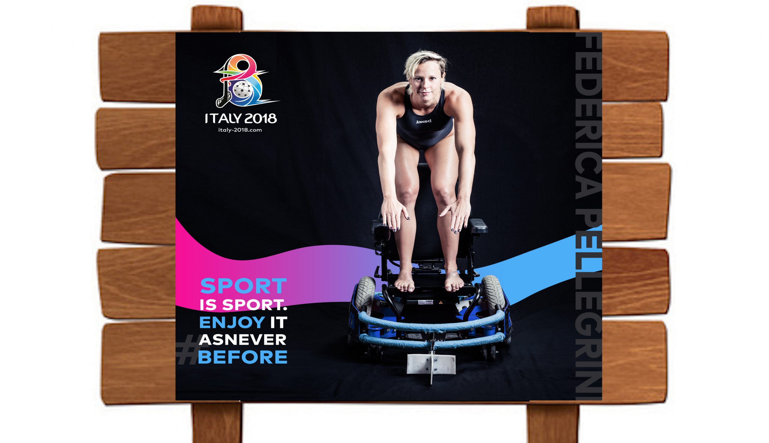 La prima immagine, quella svelata oggi, rappresenta la Divina (1 oro olimpico, 6 ori mondiali, 14 ori europei) pronta a fare il gesto tecnico principe del nuoto, il tuffo dai blocchi di partenza, che qui sono rappresentati da una carrozzina da hockey.