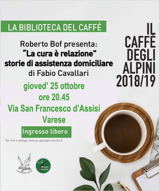 L’appuntamento con il “Caffè degli Alpini” di giovedì alle 20.45 nella sede dei Monelli della Motta in via San Francesco 26 a Varese è con lo scrittore Fabio Cavallari autore del libro “La cura è relazione”, storie di assistenza domiciliare.